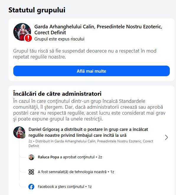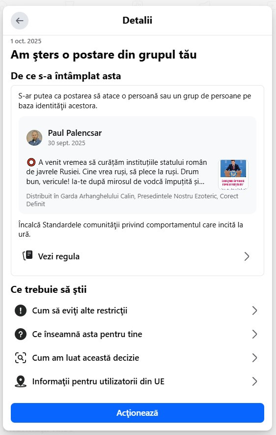 Și nu-i doar cazul meu. Grupul anti-suveranist pe care l-am înființat – o platformă cu 6000 de oameni care se opun propagandei putiniste și pseudo-patriotarde – e acum cu securea deasupra capului. Știi de ce? Pentru că un moderator a admis distribuirea unui articol al lui Paul Palencsar în care se spunea limpede: „Trebuie să curățăm instituțiile statului român de javrele Rusiei”. Atât. O constatare de bun simț într-o țară aflată în plin război hibrid cu Federația Rusă, unde agenții de influență se plimbă nestingheriți prin birouri publice și studiouri TV. Ei bine, exact asta e considerată „instigare” de Facebook. Nu faptul că trollii suveraniști cer spânzurări, decapitări, jupuiri în piața publică, arderea de vii a opozanților. Nu propaganda directă a Moscovei. Ci chemarea la igienă instituțională.